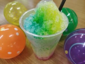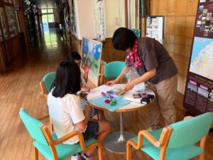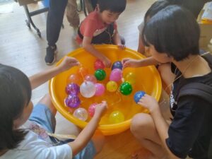 その事業に女性部の有志で、夏祭りで未使用だったヨーヨー釣りを贈呈。今回は中高生とのコラボ企画との事で全般子供たちが